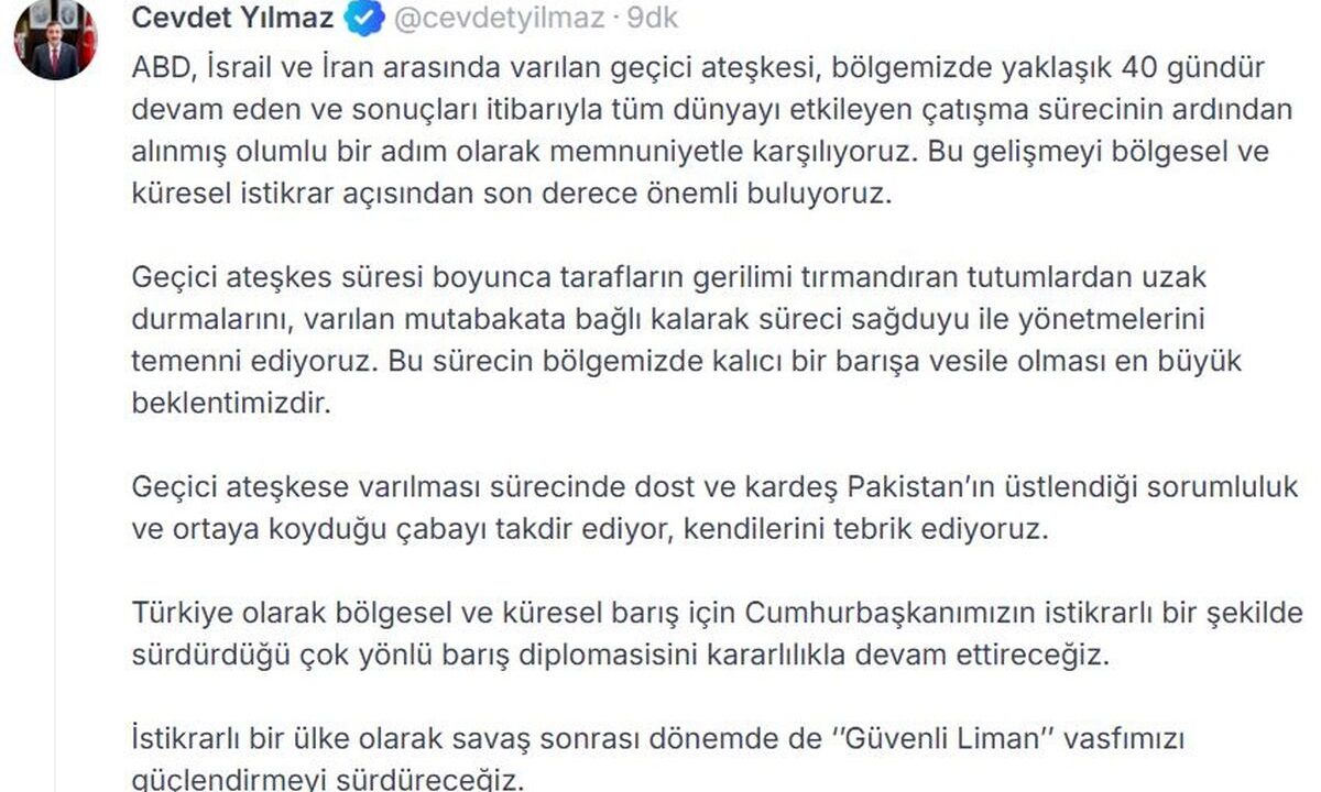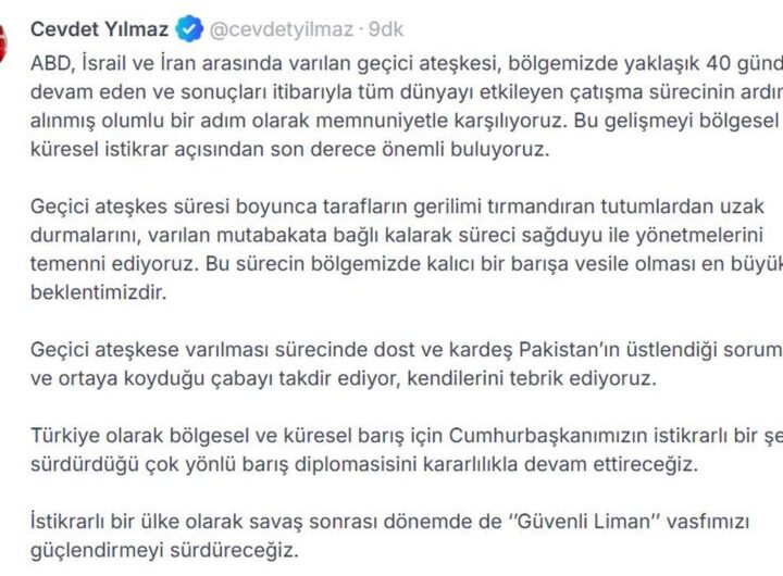 Cumhurbaşkanı Yardımcısı Cevdet Yılmaz, ABD, İsrail ve İran arasındaki geçici ateşkeşi olumlu bir gelişme olarak değerlendirdi. Yılmaz,...