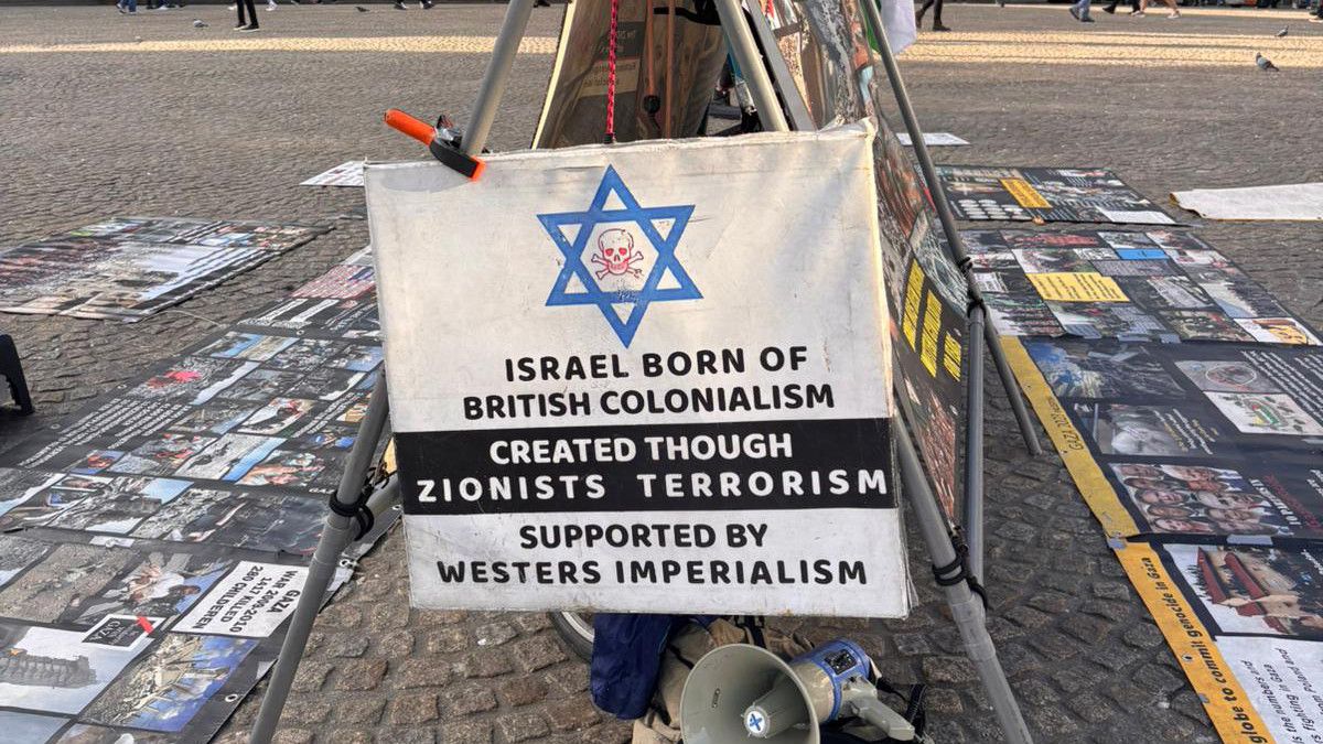 Aktivist, ayrıca Batılı ülkelerin İsrail’e verdiği desteği de eleştirerek İsrail bayrağının yer aldığı bir dövize, “Siyonist terörizm” ibaresini not düştü.