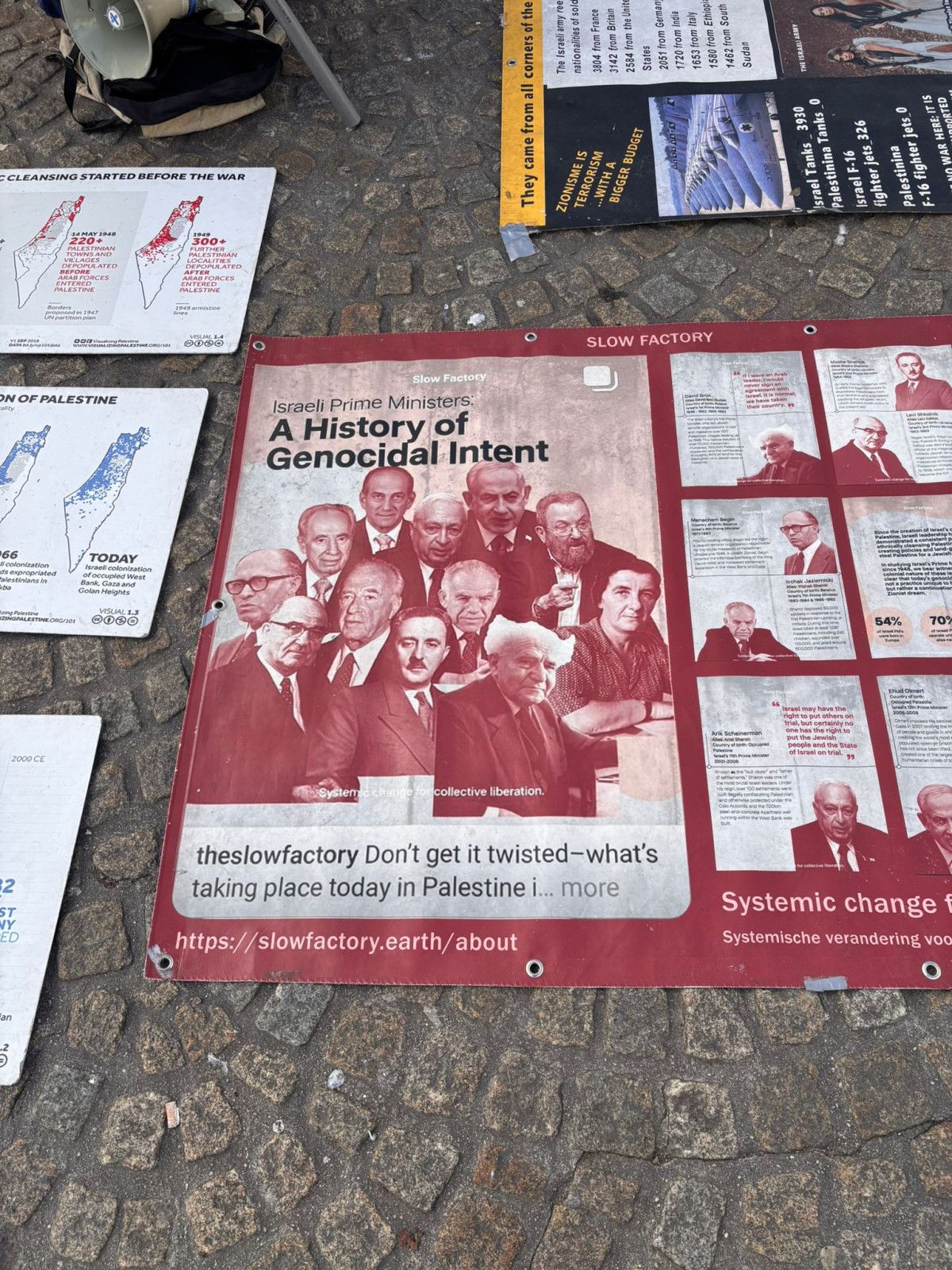 Bazı afişlerde ise İsrail’in politikaları “sömürgecilik” ve “etnik temizlik” olarak tanımlandı.